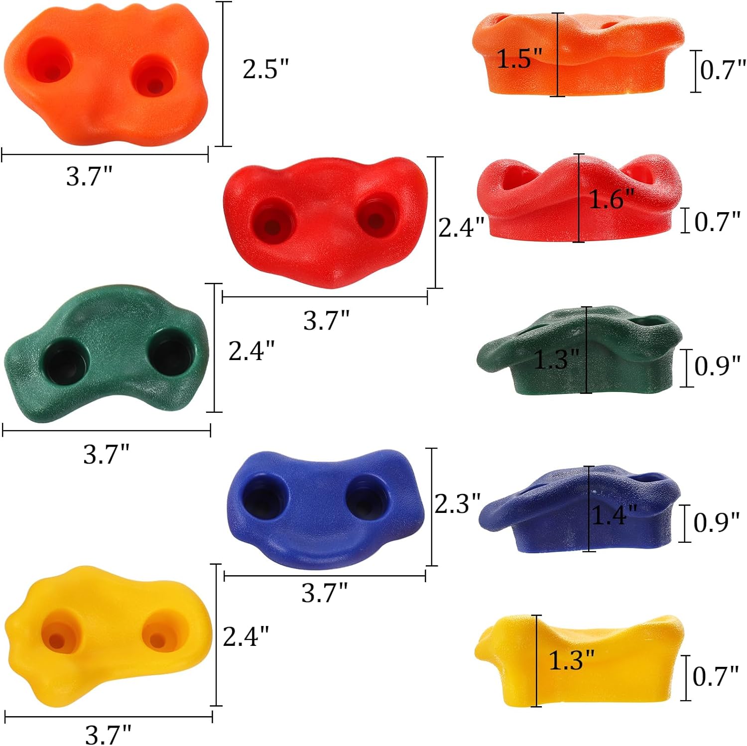 - The set comes in 5 vibrant colors (red, orange, yellow, green, and blue) with multiple shapes, offering kids a fun and engaging climbing experience. There are 12 rocks in total, with 5 rocks of each color.